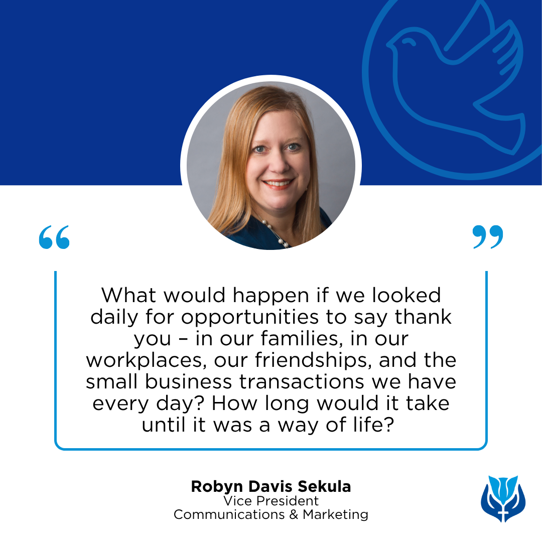 ¿Qué pasaría si buscáramos a diario oportunidades para dar las gracias, en nuestras familias, en nuestros lugares de trabajo, en nuestras amistades y en las pequeñas transacciones comerciales que hacemos cada día? ¿Cuánto tardaría en convertirse en una forma de vida?