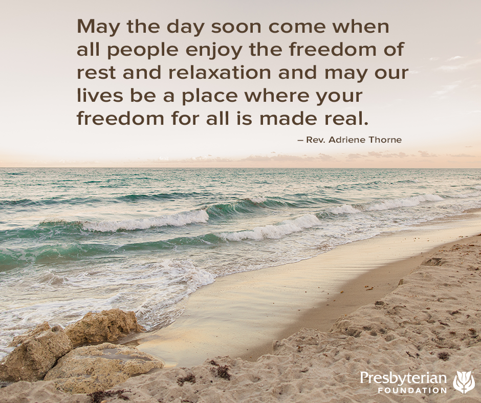 여름의 따뜻함과 자유로움 속에서 우리는 신혼부부, 새 부모, 시험을 마친 학생, 아름다운 해변의 모래처럼 펼쳐진 휴식과 안식의 날들을 축하하는 사람들과 함께 축하합니다. 우리는 또한 일하지 않으면 수입이 없어 이번 여름에 쉬지 못하는 하나님의 자녀들이 너무 많다는 사실을 염두에 두고 있습니다. 이들과 전 세계의 다른 하나님의 자녀들을 위해 기도하는 동안에도, 우리는 하나님의 백성과 지구의 휴식과 안식에 대한 책임이 우리 모두에게 있음을 깨닫게 해달라고 기도합니다. 이 모든 것을 사랑의 하나님, 당신의 손에 맡깁니다. 모든 사람이 쉼과 휴식의 자유를 누리는 날이 속히 오기를, 그리고 우리의 삶이 모두를 위한 당신의 자유가 실현되는 곳이 되기를 기도합니다.